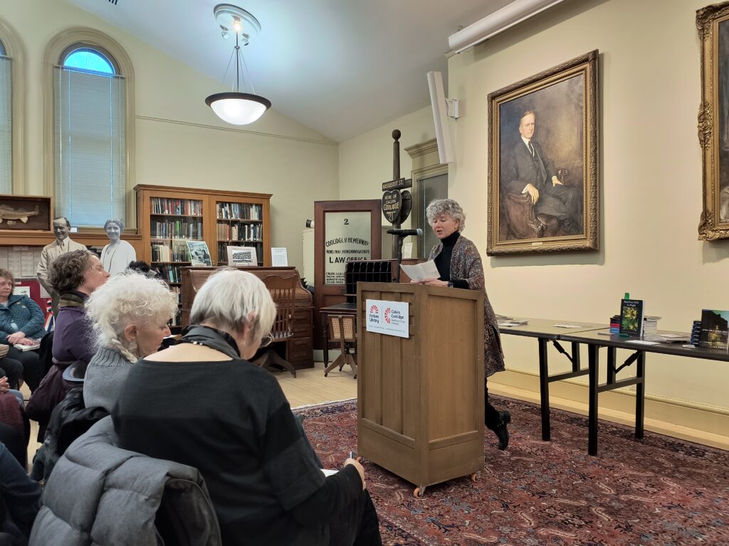 The reading was held in the Calvin Coolidge Memorial Museum in the Forbes Library in Northampton. The wood paneling and large portraits of the former President and his wife made for an elegant backdrop to the reading.