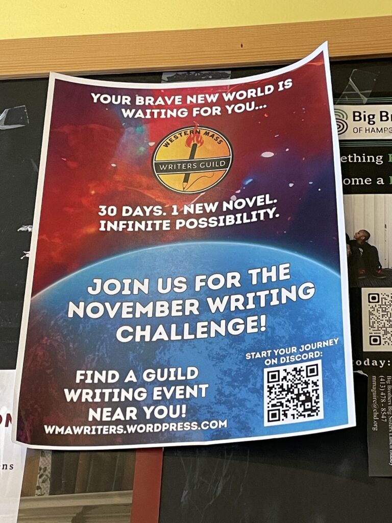 The organization began as the Western Mass regional group for NaNoWriMo. But, after the collapse of that organization, they decided to reorganize as the Western Mass Writers Guild. Originally, they were primarily focused on novel writing in November.